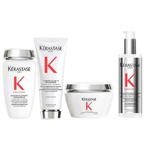 Kit com tratamento pré-shampoo, shampoo, condicionador e máscara para todos os tipos de cabelos danificados. Kérastase Première elimina a sobrecarga de cálcio e proporciona reparação profunda.