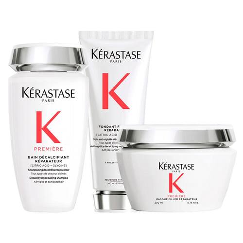 O Kit Kérastase Première Réparateur contém 1 Shampoo de 250 ml, 1 Condicionador de 200 ml e 1 Máscara de 200 ml. O Shampoo Kérastase Bain Décalcifiant Réparateur Première, é descalcificante, reparador, sem sulfato, limpa suavemente o couro cabeludo e o cabelo, enquanto remove o excesso de cálcio, que enfraquece ainda mais o cabelo. Ele repara o núcleo do cabelo, com isso as quebras são reduzidas e sua força é restaurada.