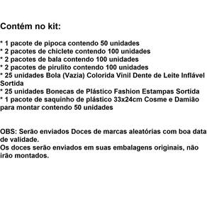 Kit Premium Para 50 Pessoas Cosme E Damião Doces + Brinquedos Contém no kit: 1 pacote de pipoca contendo 50 unidades 2 pacotes de chiclete contendo 100 unidades 2 pacotes de bala contendo 100 unidades 2 pacotes de pirulito contendo 100 unidades 25 unidades Bolas Vazia Vinil dente de leite Colorida 25 unidades Bonecas Fashion de Plástico 1 pacote de saquinho de plástico 33x24cm Cosme e Damião para montar contendo 50 unidades OBS: Serão enviados Doces de marcas aleatórias com boa data de validade. Marca: Não Informado