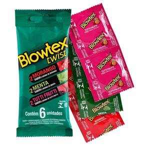 O pack de preservativos Blowtex Twist é uma explosão de sabores. A cada dia. uma nova aventura: Menta. Tutti-Frutti e Morango em uma só embalagem. Aromas especiais: recrescência que a Menta proporciona. curtição com um gostinho todo especial de tutti frutti ou a sensualidade do sabor do Morango? é só escolher o sabor e aroma. que vem junto ao lubrificante.