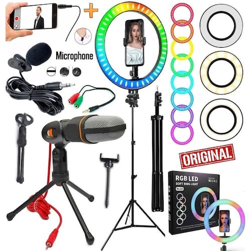 Kit profissional hing light grande rgb suporte celular microfone de mesa + lapela tripé 2 metros makeup selfie completo Kit youtuber com eletrônica Kit microfone de mesa + lapela iluminador ring light rgb tripé 2,10m Kit profissional,completo,de qualidade e com eletrônica.São itens incluindo tripé todo em alumínio para melhor qualidade de seus vídeos e fotos. Com este modelo você consegue usar o celular tanto na vertical quanto na horizontal Possui também ball head permite rotação de 360º do ring O kit contém: 1 microfone de lapela 1 microfone condensador de mesa profissional com mini tripé 1 tripé de até 2,10m de alcance 1 anel ring light de led 26cm rgb 1 encaixe articulado 1 suporte de celular para o ring light 1 adaptador p2 O adaptador permite que o microfone de lapela seja utilizado Em celulares ou em aparelhos que não tenham entrada para plug p2 de 3 vias comprimento do cabo do microfone de lapela: 1 metro e meio. Aviso: em celulares nokia com o sistema operacional windows phone não funciona. O microfone condensador de alta sensibilidade profissional é um dos mais completos do mercado, com ótimo custo benefício. Ideal para e amador, exercendo suas gravações com maestria. Possui conexão p2 padrão de microfone, o que torna o uso universal seja em pc,notebook,também acompanha adaptador para usar o microfone em celulares. O ring light led rgb possui 6 tipos de cores, tem 3 opções de temperatura de cores e 10 opções de intensidade da cor, podendo ser alternados direto no controle de iluminação, os efeitos podem ser de acordo com diferentes ambientes de escurecimento. Também possui as cores tradicionais -branco -branco frio -branco quente Com o ball head em rotativa de 360 graus é fácil de ajustar o ângulo de luz desejado Sua alimentação é atraves do usb que pode ser em computador host, laptop, banco de energia móvel ou ligado na tomada através de um adaptador de celular não acompanha O ring light é perfeito para streaming , estudos, fotos, video, filmagem e muito mais. Características do produto: . Possui controle remoto com fio para controle das cores e efeitos desejados em seus ambientes, vídeos e fotos; . Possui tripé de 2,10 cm de altura, super resistente que proporciona maior estabilidade para o equipamento; Está incluso também o suporte pra colocar o celular no meio do ring light Dimerizável: sim Tamanho do ring light: 26 cm - equivalente a 10 polegadas Possui suporte para celular: sim Melhor kit custo benefício. Postamos em até 24 horas úteis. Importante: Fotos ilustrativas Kit acompanha uma unidade de cada item Homologação Anatel: 060792000160