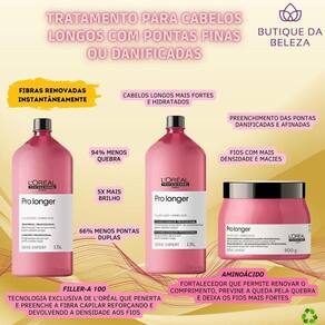Kit Profissional Shampoo E Condicionador 1,5 L E Máscara 500G Loreal Pro Longer Este kit contém01 shampoo l'oréal professionnel pro longer 1500ml01 condicionador l'oréal professionnel pro longer 1500ml01 máscara l'oréal professionnel pro longer 500mlSomos a butique da belezaUma empresa especializada no comércio de cosméticos e semijoias.Estamos sempre entre os melhores vendedores.Nosso compromisso é com vocêSeu conforto e segurança são nossos propósitosServir e ajudar são nossos deveresA linhaA linha pro longer de l'oréal foi desenvolvida especialmente para cabelos longos com pontas afinadas ou danificadas.Ativos Filler-a100Tecnologia exclusiva de l'oréal, que penetra e preenche a fibra capilar reforçando e devolvendo a densidade aos fios. AminoácidoPoderoso fortalecedor que permite renovar o comprimento, previne a queda pela quebra e deixa os fios mais fortes. Indicado- cabelos danificados.- cabelos quebradiços.- cabelos frágeis.- cabelos com pontas finas.- todos os tipos de cabelos.Benefícios- limpeza.- força.- resistência.- hidratação.- crescimento fortificado.- redução de pontas duplas.- proteção antiquebra.- densidade às pontas.- brilho.- maciez.Shampoo l'oréal professionnel pro longer O shampoo pro longer apresenta uma fórmula exclusiva que renova a aparência da fibra instantaneamente, devolvendo densidade às pontas, além de deixar o cabelo mais forte, macio e com 5x mais brilho.Traz a tecnologia da co-emulsão, com moléculas 50 vezes menores, que penetra profundamente na fibra e forma um filme protetor, aperfeiçoando a superfície do cabelo. Seus cabelos com um toque leve e suave, com 94% menos quebra, 66% menos pontas duplas e 5x mais brilhoCondicionador l'oréal professionnel pro longer O condicionador l'oréal devolve densidade às pontas dos fios, proporcionando uma redução de 34% das pontas duplas.Com fórmula exclusiva, o condicionador pro longer garante melhor resultado em pontas finas ou em áreas onde o preenchimento é mais necessário. Máscara l'oréal professionnel pro longer Máscara l'oréal pro longer hidrata e devolve densidade aos fios.Com ação renovadora, confere uma redução de até 66% das pontas duplas.Modo de uso- shampooCom os cabelos molhados, aplique o shampoo e massageie até formar espuma. Enxágue.- condicionadorCom os cabelos lavados e úmidos, aplique no comprimento e pontas, massageie e deixe agir por 2 a 3 min. Enxágue. Não é recomendado o uso na raiz dos cabelos.- máscaraCom os cabelos lavados e úmidos, após a utilização do shampoo, aplique a máscara e deixe agir de 3 a 5 min. Enxágue. Dica butique da belezaPara melhores resultados, use a linha completa pro longer, de l'oréal.