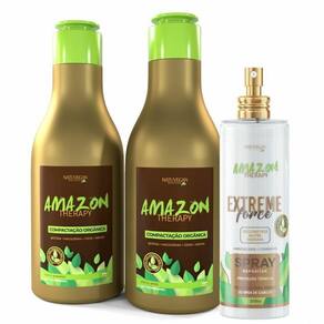 O combo de amazon therapy é composto por um shampoo antirresíduos, tratamento orgânico para o realinhamento, spray com proteção térmica. Combo pensado para fornecer uma transformação perfeita sem danificar os fios.