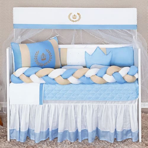 A Coleção Coroa Luxo é um clássico devolvido para o quarto de seu bebê elegante e luxuoso. Oferece todo conforto que o bebê necessita e dá um toque especial na decoração do quarto. O Kit Berço Trança acompanha 11 peças, incluindo a saia box, edredom matelado dupla face.