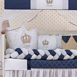 1 Cabeceira------------------0.57 x 0.37 mts 1 Lateral -----------------------1.25 x 0.25mts 1 Trança --------------------1.25 x 0.12 mts 1 Lençol de cima ------------1.30 x 0.90 mts ------ 100% ALGODÃO 1 Fronha ---------------------0.28 x 0.38 mts ------ 100% ALGODÃO 1 Bando do mosqueteiro---1.40 x 0.20 mts 1 Mosqueteiro---------------4.50 x 1.50 mts 1 Edredom-------------------1.30 x 0.75 mts 1 Trocador -------------------0,50 x 0,40 mts 1 Almofada Coroa --------0.35 x 0.30 mts 1 SAIA BOX -------------1,30 x 0,70 x 0,30 mts Descrição das peças :Tecido estampado 100% algodão Tecido liso 100% poliéster Jogo de lençol tecido 100% ALGODÃO Enchimento 100% poliéster Mosqueteiro 100% poliamida Informações Importantes: O produto já vai pronto para o uso, com o enchimento já incluso. Acompanha as peças conforme a descrição, não esta incluso o Berço A cabeceira e as laterais do kit possuem zíper para retirar o enchimento, facilitando assim uma possível lavagem do produto.