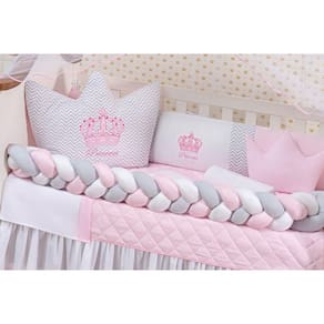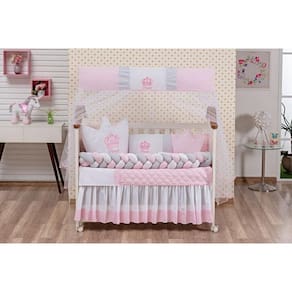 TOTAL 11 PEÇAS 1 Cabeceira------------------0.57 x 0.37 mts 1 Lateral -----------------------1.25 x 0.25mts 1 Trança --------------------1.25 x 0.12 mts 1 Lençol de cima ------------1.30 x 0.90 mts ------ 100% ALGODÃO 1 Fronha ---------------------0.28 x 0.38 mts ------ 100% ALGODÃO 1 Bando do mosqueteiro---1.40 x 0.20 mts 1 Mosqueteiro---------------4.50 x 1.50 mts 1 Edredom-------------------1.30 x 0.75 mts 1 Trocador -------------------0,50 x 0,40 mts 1 Almofada Coroa --------0.35 x 0.30 mts 1 SAIA BOX -------------1,30 x 0,70 x 0,30 mts Descrição das peças :Tecido estampado 100% algodão Tecido liso 100% poliéster Jogo de lençol tecido 100% ALGODÃO Enchimento 100% poliéster Mosqueteiro 100% poliamida Informações Importantes: O produto já vai pronto para o uso, com o enchimento já incluso. Acompanha as peças conforme a descrição, não esta incluso o Berço A cabeceira e as laterais do kit possuem zíper para retirar o enchimento, facilitando assim uma possível lavagem do produto. Marca: L2m