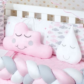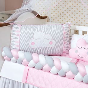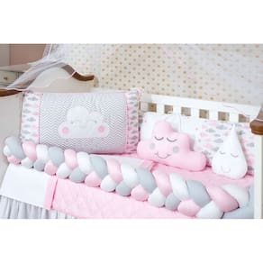 Kit Protetor de Berço Menina Nuvem Trança 11 Peças. Serve em berço americano e nacional. Pronto para deixar sua princesa mais segura e confortável, o Kit Berço Nuvem Trança deixa o quarto da sua pequena mais alegre e cheio de amor. Nessa criação exclusiva, a decoração do quarto de bebê ganha estampas e bordados . O edredom Dupla Face Matelado aquece nos dias mais frios do ano, enquanto o jogo de lençol, com fronha, lençol de cima evita o contato entre o neném e a superfície do colchão. Preocupado com a segurança do seu amor, os protetores cabeceira e laterais evitam o contato do bebê com a estrutura do móvel, dessa maneira eles não prendem os bracinhos e as perninhas nas grades. TOTAL 11 PEÇAS 1 Cabeceira------------------0.57X0.37 mts 1 Lateral -----------------------1.25X0.25mts 1 Trança --------------------1.25X0.12 mts 1 Lençol de cima ------------1.30X0.90 mts ------ 100% ALGODÃO 1 Fronha ---------------------0.28x0.38 mts ------ 100% ALGODÃO 1 Bando do mosqueteiro---1.40x0.20 mts 1 Mosqueteiro---------------4.50x1.50 mts 1 Almofada nuvem --------0.40x0.20 mts 1 Almofada Gota ----------0,30 x 0,22 mts 1 SAIA BOX -------------1,30 x 0,70 x 0,30 mts 1 Edredom-------------------1.30X0.75 mts Descrição das peças :Tecido estampado 100% algodão Tecido liso 100% poliéster Jogo de lençol tecido 100% ALGODÃO Enchimento 100% poliéster Mosqueteiro 100% poliamida Informações Importantes: O produto já vai pronto para o uso, com o enchimento já incluso. Acompanha as peças conforme a descrição, não esta incluso o Berço A cabeceira e as laterais do kit possuem zíper para retirar o enchimento, facilitando assim uma possível lavagem do produto. Marca: L2m