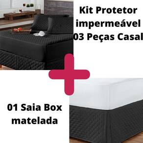 Kit protetor colchão casal + 2 capa de travesseiro impermeável + saia box preto O kit impermeável matelado é o um combo indispensável para sua cama. O protetor e o porta travesseiros impermeável irão proteger seu colchão e travesseiro de eventuais acidentes com bebidas, líquidos, sujeira em geral e também da transpiração noturna, o que poderá proporcionar maior vida útil para seu enxoval.