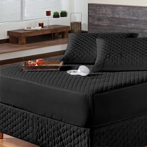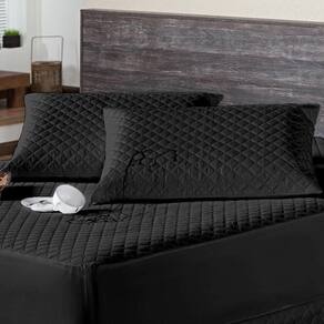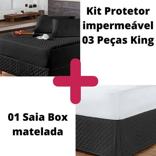 Kit protetor colchão king + 2 capa de travesseiro impermeável + saia box preto O kit impermeável matelado é o um combo indispensável para sua cama. O protetor e o porta travesseiros impermeável irão proteger seu colchão e travesseiro de eventuais acidentes com bebidas, líquidos, sujeira em geral e também da transpiração noturna, o que poderá proporcionar maior vida útil para seu enxoval.