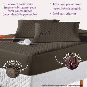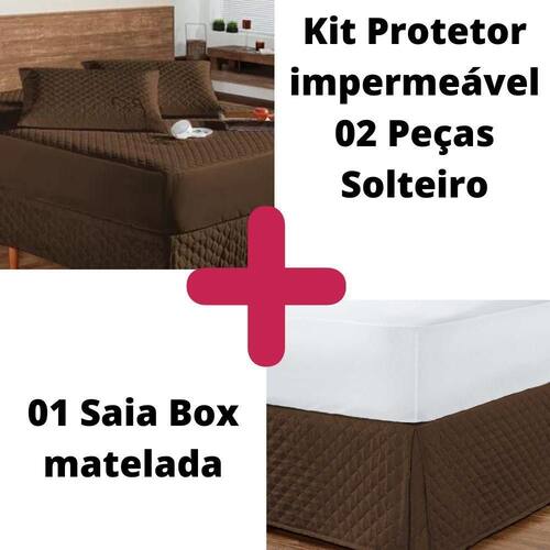 Kit protetor colchão solteiro + 1 capa de travesseiro impermeável + saia box marrom O kit impermeável matelado é o um combo indispensável para sua cama. O protetor e o porta travesseiros impermeável irão proteger seu colchão e travesseiro de eventuais acidentes com bebidas, líquidos, sujeira em geral e também da transpiração noturna, o que poderá proporcionar maior vida útil para seu enxoval.
