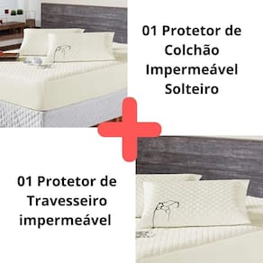 Kit Protetor Colchão Solteiro + Capa Travesseiro Impermeável Palha O KIT IMPERMEÁVEL MATELADO é o um combo indispensável para sua cama. O protetor e o porta travesseiros impermeável irá proteger seu colchão e seu travesseiro de eventuais acidentes com bebidas, líquidos, sujeira em geral e também da transpiração noturna, o que poderá proporcionar maior vida útil para seu enxoval.