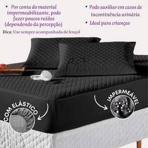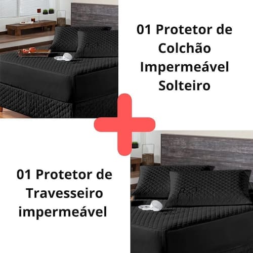 Kit Protetor Colchão Solteiro + Capa Travesseiro Impermeável Preto O KIT IMPERMEÁVEL MATELADO é o um combo indispensável para sua cama. O protetor e o porta travesseiros impermeável irá proteger seu colchão e seu travesseiro de eventuais acidentes com bebidas, líquidos, sujeira em geral e também da transpiração noturna, o que poderá proporcionar maior vida útil para seu enxoval.