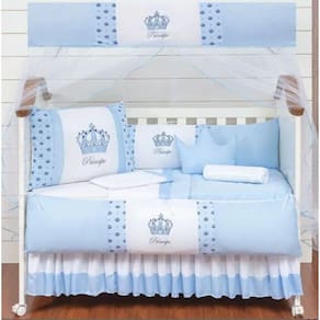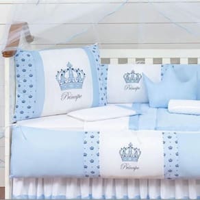 O Kit Protetor de Berço Coroa vem com 12 peças para preparar e decorar o bercinho do seu bebê com praticidade e beleza, incluindo um lençol extra. As laterais e cabeceiras acompanham zíper para facilitar a lavagem do produto. Estampado com coroa de príncipe, o Kit proporciona ao quartinho com muito mais personalidade e conforto.Itens inclusos01 Cabeceira de 0.65 x 0.40 m02 Lateral de 1.25 x 0.25 m02 Lençol de cima de 1.30 x 0.70 m01 Fronha de 0.28 x 0.38 m01 Bando do mosquiteiro de 1.40 x 0.20 m01 Mosquiteiro de 4.50 x 1.50 m01 Edredom de 1.30 x 0.75 m01 Almofada Coroa de 0.40 x 0.25 m01 Trocador de 0,60 x 0,40 m01 Saia box de 1,30 x 0,70 x 0,30 mEspecificações técnicasMarca: Beatriz EnxovaisModelo: Kit Protetor de Berço CoroaCor: Azul ClaroQuantidade peças: 12Composição tecido estampado: 100% algodãoComposição tecido liso: 50% Algodão / 50% PoliésterEnchimento: 100% PoliésterMosquiteiro: 100% PoliamidaObs.: O produto já vai pronto para o uso, com o enchimento já incluso. Acompanha as peças conforme a descrição, não esta incluso o berço. Marca: L2m