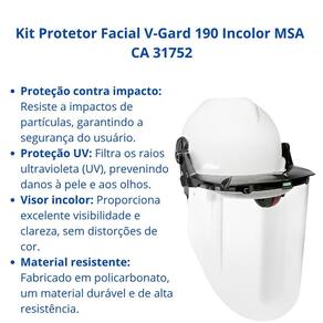 Kit Protetor Facial V-Gard 190 Incolor MSA CA 31752 Proteção Completa para Ambientes de Risco O Kit Protetor Facial V-Gard 190 Incolor da MSA oferece proteção essencial para o rosto contra impactos e raios UV. Composto por suporte e visor de policarbonato, é um equipamento robusto e confiável para diversas atividades que exigem segurança facial. Benefícios
