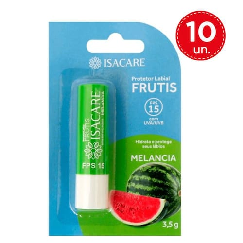 O Protetor Labial Isacare Frutis Melancia contêm FPS 15 oferecendo proteção a luz solar contra os raios UVA e UVB. Foi formulado com manteiga de karité e pigmentos brilhantes que proporcionam uma profunda hidratação que dura por muito tempo. É um produto dermatologicamente testado que possui aroma de morango. E além disso tem uma textura incrível que desliza com facilidade pela boca de maneira uniforme, deixando seus lábios macios e hidratados com muita praticidade.