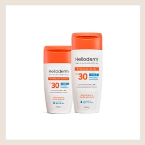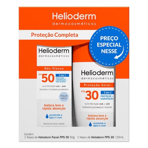Kit Protetor Solar Corporal Helioderm Suncare FPS 30 120ml + Facial Antioleosidade FPS 50 50g O Kit Helioderm Proteção Completa Corpo FPS30 e Rosto FPS50 é ideal para um cuidado completo do corpo e do