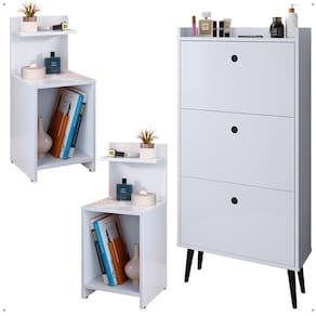 A Mesa de Cabeceira conta com uma prateleira suspensa e um nicho aberto, atributos essenciais para exibir objetos decorativos ou organizar itens de uso diário. Já a Sapateira possui gavetas basculantes com amplo espaço para a organização de calçados, mantendo tudo em seu devido lugar.