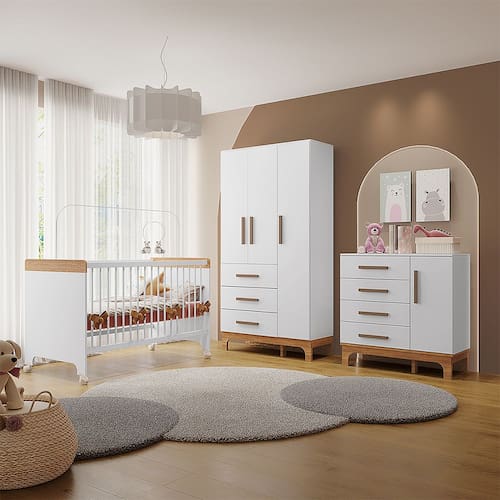 O Kit Quarto Infantil Doçura reúne os três móveis essenciais para montar um quarto funcional, bonito e seguro: guarda-roupas, cômoda e berço. Ideal para quem já possui colchão ou deseja escolher separadamente, este conjunto oferece praticidade no dia a dia, com design moderno e estrutura resistente em MDF 100%.