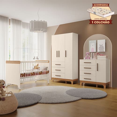 Ideal para quem busca uma solução completa, esta versão do Kit Quarto Infantil Doçura acompanha um colchão padrão americano, perfeito para proporcionar conforto, proteção e mais praticidade na hora de montar o quarto do bebê.