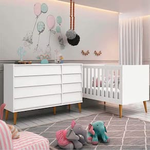 O Kit Quarto Infantil Noah Square Branco Fosco com Pés em Madeira Retrô – Berço Mini Cama + Cômodacombina beleza e versatilidade para acompanhar o crescimento dos pequenos.