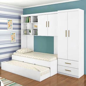 Quarto Modulado Infantil 4 Peças Cama Solteiro e Auxiliar Guarda Roupa 2 Portas Armario Aéreo Com Nichos Chiara Branco - Phoenix Baby