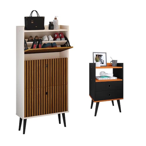 Kit Quarto Sapateira Vertical 3 Gavetas Basculantes Dark Off White/Ripado e Mesinha Lateral Pequena Nicho Organizador Dream Preto/Cinamomo – RPM - Off White