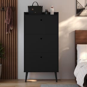 A Sapateira Dark conta com três gavetas basculantes, tornando o acesso aos calçados fácil e prático, já que a gaveta se inclina para baixo quando aberta, permitindo que você visualize e retire os sapatos com facilidade.