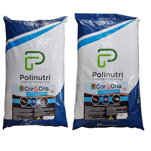 Kit 1 saco Ração Poli-nutri Cor&Cria CK2 e 1 saco de ração CK3 Crescimento para Carpa e Kinguio 15Kg cada Alimento completo desenvolvido para o crescimento de carpas e kinguios de lagos ornamentais. Indicado para carpas entre 15cm e 30cm. Tamanho CK2 - grão médio em formato de bolinhas aproximadamente 5mm Saco de 15 Kg. Tamanho CK3 - grão grande em formato de sticks aproximadamente 5mm de diâmetro por 1cm de comprimento Saco de 15 Kg. Indicado para carpas acima de 30cm. Recomenda-se uso diário em 4 ou mais vezes ao dia. Produto fabricado no Brasil
