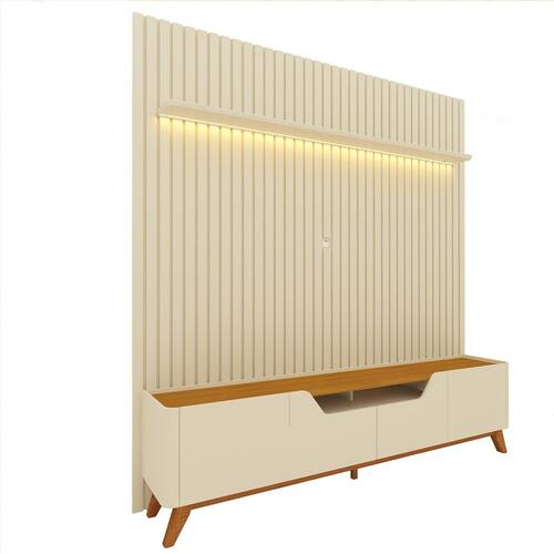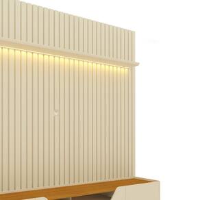 Complementando o conjunto, o Painel Nobre, também construído em MDF, destaca-se pela placa de ripas autênticas, adicionando um toque de autenticidade ao ambiente. Sua prateleira com bordas chanfradas e laqueadas não apenas contribui para o design elegante, mas também oferece espaço adicional para decorações e dispositivos. Equipado com LED em cor quente e difusor, proporciona uma iluminação aconchegante para o seu espaço. Com capacidade para TVs de até 85 polegadas e suportando até 55 kg, o Painel Nobre é a peça perfeita para complementar o seu entretenimento em grande estilo.