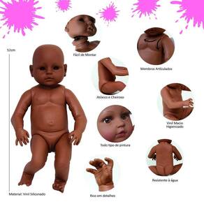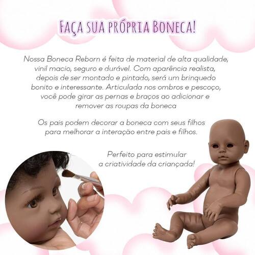 A nossa empresa tem a missão de garantir a total satisfação de seus clientes, onde a qualidade e o atendimento excepcional são nossa prioridade Estamos muito felizes em apresentar a Bebê Reborn Lara para você, um item cuidadosamente selecionado para atender às suas necessidades. Compre agora e experimente a diferença em comprar com a nossa loja.PRODUTO DIRETO DA FABRICACom um Kit Reborn Diva, você pode personalizar sua boneca de acordo com suas preferências. Isso inclui escolher as cores do cabelo, olhos e outros detalhes da boneca. Depois de ser montado e pintado, será um brinquedo bonito e interessante. Montar um kit reborn envolve habilidades manuais, como pintura, costura e colagem. Isso pode ajudar a desenvolver suas habilidades criativas.O Kit Reborn Diva inclui:1 Cabeça2 Braços2 Pernas1 Corpo1 Par de OlhosMaterial: Vinil Siliconado Atóxico Tamanho da Boneca Montada: 43 cm Cor: MarromPeso Aproximado: 0,8 kgExcelente para qualquer tipo de pinturaRecomendado para crianças maiores de 03 anosNão damos garantia para moldes queimados, cortados, já pintados ou com danos causados no manuseio.Dúvidas Frequentes:1. Qual o tamanho dela depois de montadaR. O tamanho é de 52cm.2. Vocês podem enviar outra cor de olhoR. O envio da cor do olho depende da disponibilidade do estoque.3. Qual o tamanho dos olhosR. Os olhos são de 20mm.4. O material é seguroR. Sim, o material é atóxico, totalmente seguro e de alta qualidade.5. Qual o prazo do envio do produtoR. Será enviado imediatamente após confirmação do pagamento.Tags: Kit Boneca Reborn, Boneca Bebe Reborn Molde, Kit Para Arte Reborn, Com Corpinho, Vinil Silicone, Olhos, Com Torso, Menina, Articulado, Membros Inteiros.Homologação Inmetro: CE-BRI-IDEAL 0083-21-2