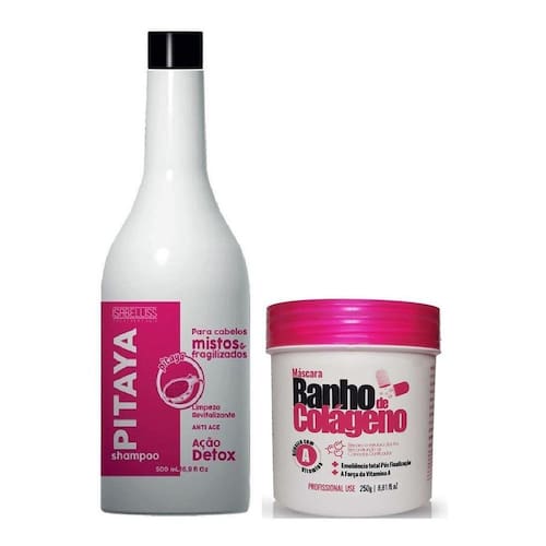 SHAMPOO PITAYAUm MARAVILHOSO produto pós progressiva revitalizante com extratos orgânicos que promovem hidratação maciez e brilho aos fios.O Shampoo Isabelliss Tratamento Hair de Pitaya é rico em vitamina C, flavanóides, considerados antioxidantes e protetores do cabelo. Limpa seletivamente preparando a fibra para o tratamento e potencializando seus resultados, além de um poderoso doador de brilho.MODO DE USOAplique sobre os cabelos molhados massageando até se formar uma espuma abundante. Enxague bem. Repita operação mais uma vez.MÁSCARA BANHO DE COLÁGENOA Nicky Cosméticos através de muitos estudos e tecnologias criou o BANHO DE COLÁGENO que foi desenvolvido especialmente para cabelos quimicamente sensibilizados.Sua fórmula com colágeno atua na restauração dos fios, reparando as áreas danificadas. Livre de sal, corantes e parabenos, recuperam a saúde e a vitalidade do cabelo, proporcionando brilho intenso e maciez profunda.MODO DE USAR:MÁSCARA: Após lavar os cabelos com shampoo da linha Banho de Colágeno, secar 90% e em seguida aplicar uma quantidade generosa de máscara Banho de Colágeno na palma das mãos e enluvar completamente os fios mecha a mecha, deixe agir de 3 a 10 minutos. Em seguida enxágue e finalize como desejar.DESCRIÇÃO RÁPIDA COMPATIBILIDADE: Compatível com qualquer marca.VALIDADE: 24 meses;Formato: Restaurador, antifrizz, Reconstrói os fios, fortifica e repara intensa e profundamente os cabelos.PROCESSO ANVISA: 25351.143141/2018-02CÓDIGO DE BARRAS: 7898679000000COMPONENTES DO KIT : Máscara 750 gr