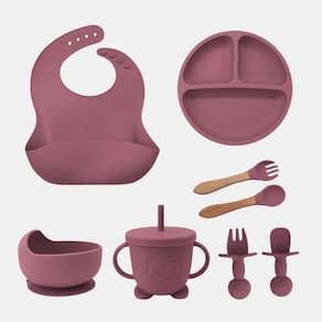 Especificações Técnicas: - Cores: Cinza, Azul, Bege, Rosa, Rosa-Claro, Verde-Musgo - Material: silicone de qualidade alimentar - Tamanhos: - Prato: 19 x 18,2 cm - Babador: 24 x 29,5 cm - Tigela: 11,2 x 11 cm - Colher: 13,5 x 3,5 cm - Copo: 14 x 14 cm - Faixa etária: a partir de 3 meses