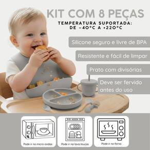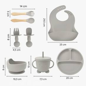 Especificações Técnicas: - Cores: Cinza, Azul, Bege, Rosa, Rosa-Claro, Verde-Musgo - Material: silicone de qualidade alimentar - Tamanhos: - Prato: 19 x 18,2 cm - Babador: 24 x 29,5 cm - Tigela: 11,2 x 11 cm - Colher: 13,5 x 3,5 cm - Copo: 14 x 14 cm - Faixa etária: a partir de 3 meses