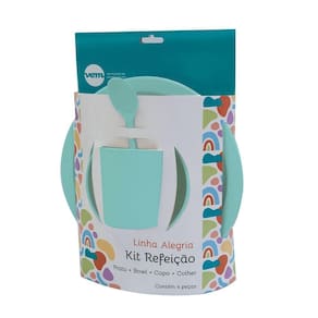 Kit Refeição Infantil VEM com 4 peças, com ele a hora da refeição vai ser um momento mais divertido. Com prato, tigela, colher e copo de alta qualidade, irá proporcionar uma refeição segura e mais alegre para o seu filho, adão use utensílios de cozinha em metal ou quaisquer objetos afiados que possam riscar o produto. Use somente os objetos apropriados, como as espátulas e colheres de silicone da VEM, que não irão riscar o produto.Lave em água com detergente neutro e enxágue bem ou lave na parte superior máquina de lavar louça;Se os alimentos grudarem, deixe os recipientes cheios com água quente e com detergente neutro;Não utilize esfregões ou esponjas de aço de limpeza, nem detergentes abrasivos, dado que estes irão danificar os recipientes.Especificações Linha do Produto: AlegriaO KIT CONTÉM: 1 Prato 22cm x 1,8cm (diâm. x alt.) 1 Tigela 16,5cm x 3,7cm (diâm. x alt.) 300ml 1 Copo 200ml (7 cm altura) Cor: Verde ClaroMaterial: Polipropileno
