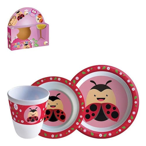 Descrição Kit infantil Refeição Personagem: Joaninha Composição: Melanina Contém: 1 Prato 22cm x 1,8cm diâm x alt 1 Tigela 16,5cm x 3,7cm diâm x alt 300ml 1 Copo 10cm alt 250ml Ean: 7899658403140