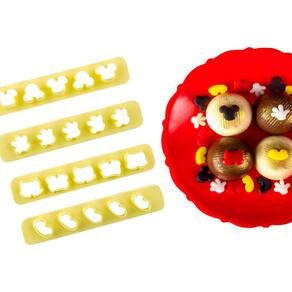 Kit régua miniaturas 3 (aproximadamente 1cm cada cavidade). Kit de quatro réguas com desenhos diferentes do tema mickey: sapato, luva, cabeça e shorts, cada uma corta cinco figuras de uma só vez. Faça lindos apliques para seus doces, bolos, tortas, lembrancinhas e decorações, surpreenda seus clientes e eleve o nível de seus trabalhos com o corte preciso e acabamento profissional que esses cortadores atribuem.