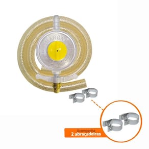 Kit regulador de gás baixa pressão 2kg completo com válvula, mangueira 1,25m e 2 abraçadeiras. Vazão de 2kg/h e pressão nominal de 2,8kpa. Mangueira em PVC flexível. Conexão compatível com botijões P13.Proteção para