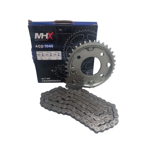 Kit Transmissão MHX para motocicletas, produzido em aço 1045 com tratamento isolante, a linha MHX É referencia em resistência e durabilidade, possui alta qualidade com melhor custo beneficio, podendo ser utilizado na grande maioria das motos de baixa e media cilindrada.