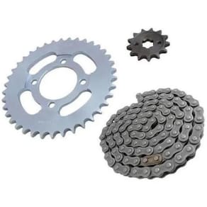 A Relação Transmissão Mobilete 4Tempo Toplet/Mobibike/Toptrail é um kit completo de relação de transmissão, composto por coroa, pinhão e corrente.