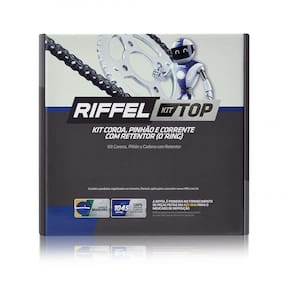 Kit relação (Transmissão).O Kit Relação Transmissão Top da Riffel é para o motociclista mais exigente, que deseja pilotar sem se preocupar. Ele é composto por uma coroa, um pinhão produzidos em aço 1045 e uma corrente O'Ring que diminui o ruído e aumenta a lubrificação da moto, tudo para proporcionar mais durabilidade, segurança e qualidade sobre as duas rodas.