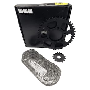 Embalagem: 01 Kit Transmissão Completo. ( Coroa, Pinhão e Corrente )