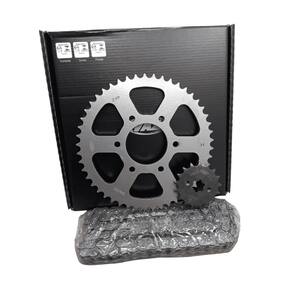 Embalagem: 01 Kit Transmissão Completo. ( Coroa, Pinhão e Corrente )