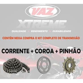 Os kits vaz são de alta performance; a coroa temperada, o pinhão e a corrente que compõem o novo kit vaz linha s de transmissão oferecem alta performance, durabilidade e maior resistência. Disponíveis em variedade de opcionais e acabamentos foram desenvolvidos a partir de modernas tecnologias, equipamentos de última geração, submetidos a tratamentos especiais e com as melhores matérias-primas.