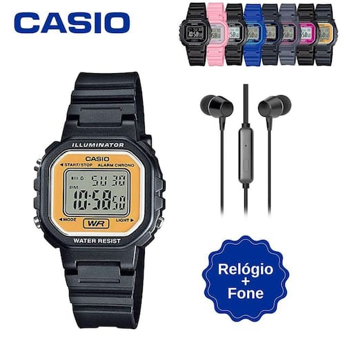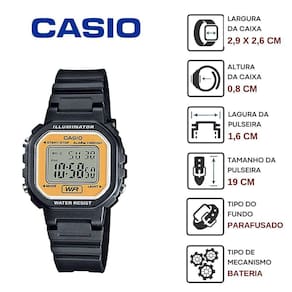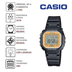 Relógio de pulso Casio Infantil Digital LA-20WHRecursos:Resistente a águaEste modelo é 3ATM/30 metros (resistentes à água). Os relógios com estas características são resistentes ao contato acidental com àgua (respingos de água, chuva, lavar as mãos, tarefas domésticas...), mas não aceita pressões.Luz de LED na cor laranjaCronômetro de 1/100 de segundoEspecificações:Material do corpo/anel: resinaPulseira em ResinaVidro com resinaResistente a águaLuz LED na cor laranjaCronômetro de 1/100 de segundoCapacidade de medição: 5959,99"Modos de medição: tempo transcorrido, divisão de tempo, tempos de 1º e 2º lugaresAlarme diárioSinalização a cada horaCalendário automático (fevereiro com 28 dias)Formatos de 12/24 horasHorário regular: hora, minuto, segundo, pm (pós-meridiano), data, diaPrecisão: ±30 segundos por mêsDuração aproximada da bateria: 5 anos em CR1616Medidas:Diâmetro da caixa: 3,5x3,1cmEspessura da caixa: 0,9cmLargura da pulseira: 1,6cmTamanho da pulseira: 19cmPeso do relógio: 16gConteúdo da Embalagem:Estojo da marcaAcessórios (correspondentes a cada modelo)Manual em PortuguêsCertificado de 01 ano junto ao FabricanteNota Fiscal Eletrônica