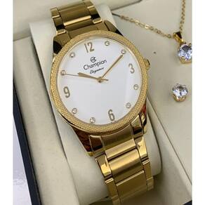 Vamos conhecer um pouco mais sobre o produto kit relógio Champion Elegance feminino dourado visor branco com cristais á prova d'água Possui mecanismo analogico, a pulseira é na cor dourada, fabricada em aço. A caixa peça onde fica o mostrador é fabricada em metal, mede 3,8 cm de diâmetro, sem considerar a coroa, e 1,1 cm de espessura, o que é considerado tamanho grande para relógios do gênero feminino. O kit relógio Champion Elegance feminino dourado dourado visor branco com cristais á prova d'água CN26082X tem nível de resistência à água especificado em 5 ATM. É fabricado por Magnum Industria da Amazônia S.A CNPJ: 63.715.510/0001 e tem de 1 ano com o fornecedor. Marca: Champion Elegance Gênero: Feminino Visor: Branco Linha: Analógico Vidro: Cristal Mineral Funções: Hora Pressão: 50 M Características: Com caixa dourada e pulseira em aço Diâmetro da Caixa: 38 mm Marca: Não Informado