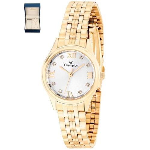 O Relógio é um dos acessórios mais presentes em todas as fases da nossa vida, mesmo com inúmeros dispositivos modernos que mostram as horas, o clássico relógio para pulso não perdeu seu charme e é uma ótima opção para complementar o visual. O Kit Relógio Champion Feminino Dourado Ch24900w é perfeito para uso pessoal ou para presentear alguém especial em uma data comemorativa, sendo um presente único, de ótimo gosto, elegância e muita praticidade. Produzido com materiais resistentes e de qualidade, a peça reúne sofisticação e estilo em um único item. A escolha perfeita para mulheres elegantes que gostam de ter um acessório incrível para complementar o look em qualquer ocasião. Marca: Champion Modelo: CH24900W Tipo de mostrador: Analógico Mecanismo: Quartz Alimentação: Bateria Formato da Caixa: Redondo Cor do mostrador: Branco com index e ponteiros na cor dourado Cor da pulseira: Dourado Cor da caixa: Dourado Material do Vidro: Cristal Mineral Material da caixa: Metal Material da pulseira: Aço Inoxidável Tipo de Fecho: Dobrável com botão Nível de Resistência à Água: 50 MT Calendário: Não Cronômetro: Não Alarme: Não Luz noturna: Não Função Chime Bip de Horas : Não possui função de Aviso de Hora Cheia Medidas: Diâmetro da Caixa: 2,7cm Espessura da Caixa: 0,86cm Largura da Pulseira: 1,1cm Peso do Relógio: 50g Conteúdo da Embalagem: Estojo Acessórios correspondentes a cada modelo Manual em Português Cerificado de do Fabricante Eletrônica peso liq aproximado do produto kg : 0,50