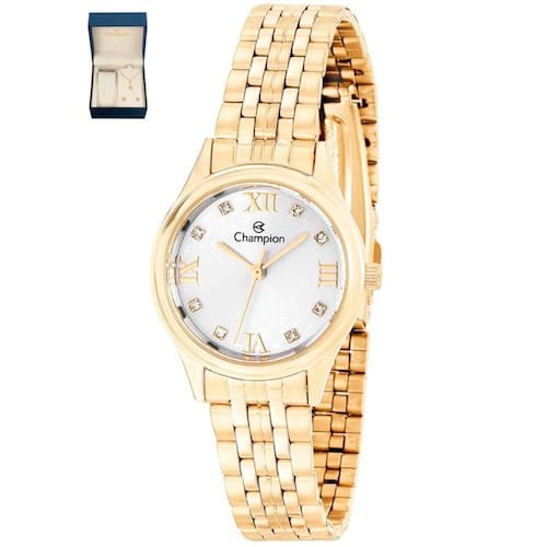 O Relógio é um dos acessórios mais presentes em todas as fases da nossa vida, mesmo com inúmeros dispositivos modernos que mostram as horas, o clássico relógio para pulso não perdeu seu charme e é uma ótima opção para complementar o visual. O Kit Relógio Champion Feminino Dourado Ch24900w é perfeito para uso pessoal ou para presentear alguém especial em uma data comemorativa, sendo um presente único, de ótimo gosto, elegância e muita praticidade. Produzido com materiais resistentes e de qualidade, a peça reúne sofisticação e estilo em um único item. A escolha perfeita para mulheres elegantes que gostam de ter um acessório incrível para complementar o look em qualquer ocasião. Marca: Champion Modelo: CH24900W Tipo de mostrador: Analógico Mecanismo: Quartz Alimentação: Bateria Formato da Caixa: Redondo Cor do mostrador: Branco com index e ponteiros na cor dourado Cor da pulseira: Dourado Cor da caixa: Dourado Material do Vidro: Cristal Mineral Material da caixa: Metal Material da pulseira: Aço Inoxidável Tipo de Fecho: Dobrável com botão Nível de Resistência à Água: 50 MT Calendário: Não Cronômetro: Não Alarme: Não Luz noturna: Não Função Chime Bip de Horas : Não possui função de Aviso de Hora Cheia Medidas: Diâmetro da Caixa: 2,7cm Espessura da Caixa: 0,86cm Largura da Pulseira: 1,1cm Peso do Relógio: 50g Conteúdo da Embalagem: Estojo Acessórios correspondentes a cada modelo Manual em Português Cerificado de do Fabricante Eletrônica peso liq aproximado do produto kg : 0,50