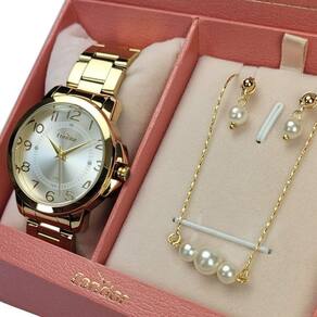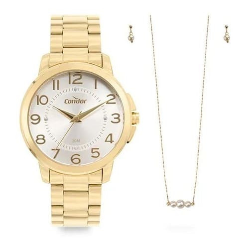 Kit Relógio Condor Feminino Analógico Dourado COPC21AEAJ/K4K- Acompanha um colar e par de brincos Marca: CondorModelo: COPC21AEAJ/K4DTipo de mostrador: AnalógicoMecanismo: QuartzoAlimentação: BateriaFormato da Caixa: RedondoCor do mostrador: Prata com Ponteiro e Index DouradoCor da caixa: DouradaCor da pulseira: DouradaMaterial do Vidro: Cristal MineralMaterial da caixa: Aço InoxMaterial da pulseira: Aço InoxTipo de Fecho: Dobrável com 2 botõesNível de Resistência à Água: 30MTCalendário: NãoCronômetro: NãoAlarme: NãoLuz noturna: NãoMedidas:Diâmetro da caixa: 3,8cmEspessura da caixa: 1,0cmLargura da pulseira: 1,8mPeso do relógio: 89gConteúdo da Embalagem:Estojo da marcaAcessórios da marca (correspondentes a cada modelo)Manual em PortuguêsCertificado de 01 ano do FabricanteNota Fiscal EletrônicaFornecedor: Technos da Amazônia Indústria e Comércio. CNPJ: 04628426/0001-86