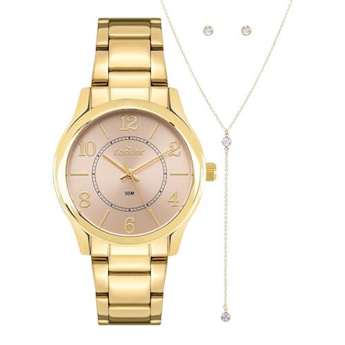Kit Relógio Condor Feminino Dourado com Colar e Brincos - 35,5mm Para quem busca um acessório elegante e delicado, o Kit Condor CO2035NRD/K4J é a escolha perfeita. Ideal para presentear ou completar seu próprio estilo, ele combina a sofisticação de um relógio dourado com o charme de um colar e brincos com brilho sutil. O relógio apresenta caixa de 35,5mm e pulseira de aço dourada, com mostrador em tom rosé suave e detalhes numéricos em dourado. Seu visual é clean, moderno e feminino, perfeito para o uso no dia a dia com muito estilo. Acompanha um colar com pingente alongado e dois brincos delicados com ponto de luz, que harmonizam perfeitamente com o relógio, tornando o kit uma excelente opção para compor looks elegantes e versáteis. Além do design encantador, o modelo conta com resistência à água de 50 metros, sendo prático para o uso cotidiano. Especificações Técnicas: Marca: Condor Modelo: CO2035NRD/K4J Gênero: Feminino Tamanho da Caixa: 35,5 mm Material da Caixa: Metal Material da Pulseira: Aço Cor da Caixa: Dourado Cor da Pulseira: Dourado Cor do Mostrador: Rosé Tipo de Vidro: Cristal Mineral Resistência à Água: 5 ATM (50 metros) Mecanismo: Analógico Alimentação: Bateria Conteúdo da Embalagem: 1 Relógio Condor Feminino 1 Colar 1 Par de brincos Estojo exclusivo Manual de instruções Certificado de garantia Garantia: 1 ano contra defeitos de fabricação (fornecida pelo fabricante)