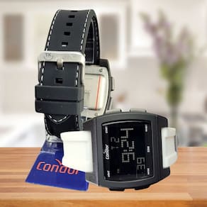 Marca: Condor Modelo: COBJ2649AK/T6P Tipo de mostrador: Digital Mecanismo: Quartzo Alimentação: Bateria Formato da Caixa: Quadrado Cor do mostrador: Negativo Cor da caixa: Preto Cor da puleira:Branco Material do Vidro: Cristal Mineral Material da pulseira: Silicone Tipo de Fecho: Fivela Nível de Resistência à Água: 50MT Calendário: Sim Cronômetro: Sim Alarme: Sim Luz noturna: Led Verde